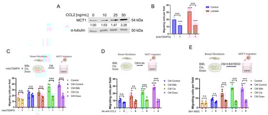 Based on our previous results, we speculate that the increased CCL2 gene expression in RMF-621 stromal cells involved the increased secretion and presence of CCL2 in the CM, which could trigger the increase in MCT1 protein levels in MCF-7 epithelial cells (Figure 3A). We observed that treatment with increased CCL2 concentrations correlates with enhanced MCT1 protein levels in MCF-7 (Figure 4A), and 20 mM lactate in the culture medium stimulates MCF-7 migration, a phenomenon that is blocked by the addition of mitoTEMPO (Figure 4B), a well-known mitochondrial antioxidant [33].
