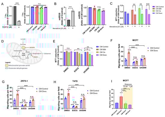 Mitochondrial pyruvate transport and glutaminolysis are required for maintaining the viability and migration of breast cancer cells exposed to CM from DNA-damaging drugs: (A) mitochondrial membrane potential (Δψm), (B) and mitochondrial superoxide production in MCF-7 cells exposed to CM from stromal cells for 24 h. FCCP (1 µM) and menadione (25 µM) were used as positive controls. (C) Vulnerability of MCF-7 cells exposed to CM from stromal cells for 48 h in the presence of a low concentration of menadione (0.5 µM), (D) diagram of mitochondrial utilization of energy substrates as pyruvate (which can be derived from glucose or lactate and incorporated into mitochondrion by mitochondrial pyruvate carrier, MPC, in IMM) and glutaminolysis, showing two inhibitors used in this study, (E) effect of MPC (5 µM UK5099) and glutamate dehydrogenase (25 µM EGCG) inhibitors on viability of MCF-7 cells exposed to CM from stromal cells treated with DNA-damaging drugs for 48 h, (F–H) effect of 25 µM EGCG and 5 µM UK5099 on the MCF-7, ZR75-1, and T47D cell migration stimulated by CM from stromal cells treated with doxorubicin (18 nM Doxo), (I) effect of rotenone (10 nM and 1 µM Rot, Complex I inhibitor) on MCF-7 migration. Data are shown as the mean ± SD, N = 4 independent experiments. * p < 0.05, ** p < 0.01, *** p < 0.001, vs. control (DMSO). n.s.: not significant.