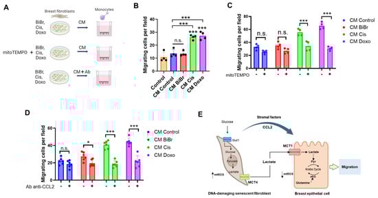 DNA-damaging drugs promote enhanced monocyte THP-1 recruitment: (A) diagram of experimental evaluation of conditioned media (CM) from fibroblasts RMF-621 treated with DNA-damaging drugs on migration, (B) effect of CM on THP-1 migration, (C) effect of CM produced by previous incubation (1 h) of mitoTEMPO (1 µM) and then DNA-damaging drugs on THP-1 migration, (D) effect of CM produced by DNA-damaging drugs and then the addition of blocking antibody anti-CCL2 (10 µg/mL) on THP-1 migration, (E) working model proposed in this work. Data are shown as the mean ± SD, N = 4–6 independent experiments. * p < 0.05, *** p < 0.001, vs. control (DMSO). n.s.: not significant.