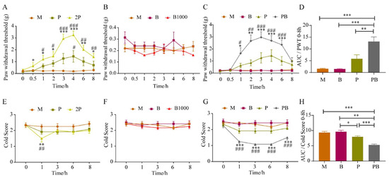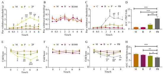 A comprehensive comparison between the P group, B group, and PB group clearly indicated that, as shown in Figure 2G, only the PB group demonstrated a significant decrease in cold score at 1, 3, 6, and 8 h after drug administration. Both the P and the B groups failed to show statistically meaningful differences from the M group. To assess the overall analgesic effectiveness of the various groups over the 0–8 h period, we computed the AUC. Notably, the analgesic effect observed in the PB group was significantly superior to that in the P group, B group, and M group (Figure 2H).