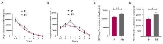 The pharmacokinetic analysis shows dexborneol’s effect on pregabalin absorption and BBB penetration. Data are presented as mean ± SEM, n = 6 animals/group. (A) Blood pregabalin levels after oral dosing with pregabalin alone (50 mg/kg, P group) vs. pregabalin 50 mg/kg + dexborneol 300 mg/kg (PB group), over 8 h. (B) Brain pregabalin levels of the two treatment groups at different time points. (C,D) AUC analysis for pregabalin blood and brain levels, highlighting the differences between the two treatment groups. Statistical significance is denoted by * p < 0.05 and ** p < 0.01.