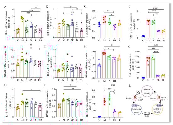 In our in vitro experiments, as shown in Figure 6G–K, LPS stimulation resulted in notable alterations in the production of inflammatory mediators, specifically including TLR4, NF-κB, TNF-α, IL-6, and IL-1β. We confirmed that the PB treatment significantly suppressed the expression of TLR4 and NF-κB in BV2 cells (Figure 6G,H). Specifically, upon LPS stimulation, we observed a notable increase in the mRNA levels of TLR4 and NF-κB genes in BV2 cells. However, the PB treatment combination markedly attenuated these LPS-induced changes. These findings implicate that PB treatment not only prevents the activation of BV2 cells but also blocks the production of inflammatory mediators via the TLR4-NF-κB signaling pathway.