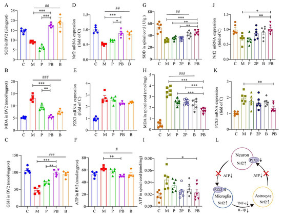 Our testing indicated a substantial decrease in SOD enzyme activity and an increase in MDA content in both LPS-stimulated BV2 cells and the spinal cords of SNI model mice (Figure 7A,B,G,H). We discovered that oxidative stress was notably more effectively mitigated in the PB group than in the P group. Specifically, following LPS stimulation in vitro, MDA levels in BV2 cells escalated remarkably. However, upon drug administration, MDA content decreased in groups P, B, and PB, with the PB group exhibiting the most significant decline (Figure 7B). The Nrf2 and SOD results revealed that only the B and PB groups demonstrated a notable increase compared to the M group, suggesting that dexborneol primarily contributes to the in vitro antioxidative activity (Figure 7A).