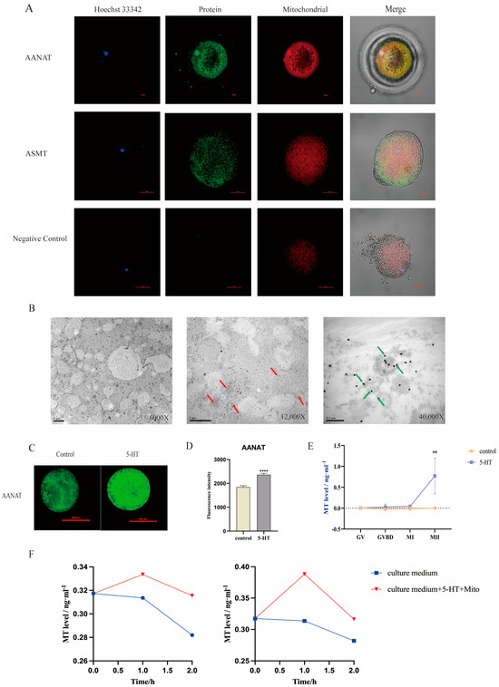 Melatonin synthesis in mitochondria during the process of the in vitro maturation of porcine oocytes. (A) Immunofluorescent staining of AANAT and ASMT in porcine oocytes. Scale bar: 50 µm. (B) AANAT subcellular distribution in porcine oocytes; red arrows point to mitochondria and green arrows point to AANAT synthetase. (C) Immunofluorescent staining of AANAT in porcine oocytes with 5HT treatment; scale bar: 100 µm. (D) Statistical analysis of AANAT level of oocytes (n = 25). (E) Melatonin levels in the culture medium of oocytes at each mature stage; n = 8. (F) Melatonin levels in the mitochondrial culture medium of granulosa cells (left) and oocytes (right); n = 3. ** p < 0.01, **** p < 0.0001.