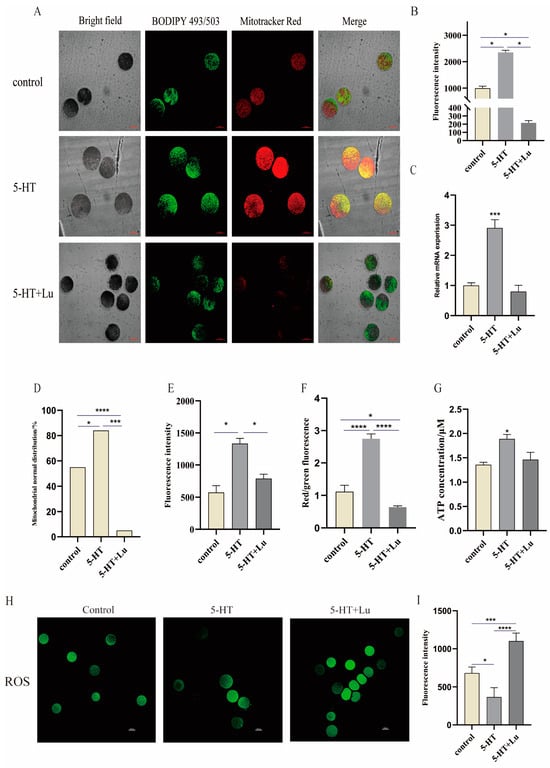 Effects of 5HT on mitochondrial function in porcine oocytes. (A) Lipid droplet and mitochondrial staining images of oocytes. (B) Statistical analysis of Mitotracker Red fluorescence staining intensity; Control (n = 20), 5-HT (n = 18), and 5-HT + Lu (n = 18). (C) Relative SIRT1 mRNA level, n = 4. (D) Mitochondrial distribution; Control (n = 20), 5-HT (n = 19), and 5-HT + Lu (n = 17). (E) BODIPY493/503 fluorescence staining intensity; Control (n = 19), 5-HT (n = 18), and 5-HT + Lu (n = 19). Scale bar: 100 μm. (F) Mitochondrial membrane potential. (G) ATP level of porcine oocytes, n = 36. (H) ROS staining images of porcine oocytes. (I) ROS levels in oocytes; Control (n = 22), 5-HT (n = 31), and 5-HT + Lu (n = 34). Scale bar: 100 μm. * p < 0.05, *** p < 0.001, and **** p < 0.0001.