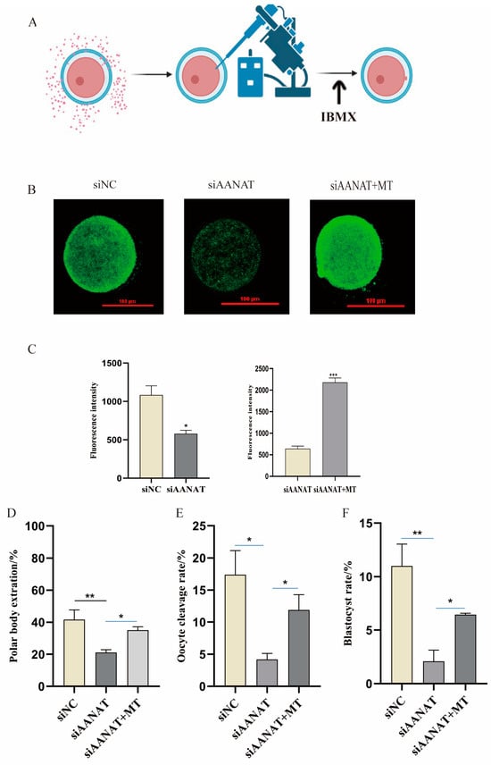 Effects of siAANAT on the maturation quality of porcine oocytes. (A) siRNA flowchart. (B) Immunofluorescence staining of AANAT protein in pig oocytes. Scale bar: 100 μm. (C) Statistical analysis of the fluorescence intensity of the AANAT protein. siNC (n = 39), siAANAT (n = 23), and siAANAT + MT (n = 19). (D) Polar body extraction rate. siNC (n = 355), siAANA T (n = 473), and siAANAT + MT (n = 254). (E) Cleavage rate. siNC (n = 125), siAANAT (n = 94), and siAANAT + MT (n = 93) groups. (F) Blastocyst rate. siNC (n = 125), siAANAT (n = 94), and siAANAT + MT (n = 93) groups. * p < 0.05, ** p < 0.01, *** p < 0.001.