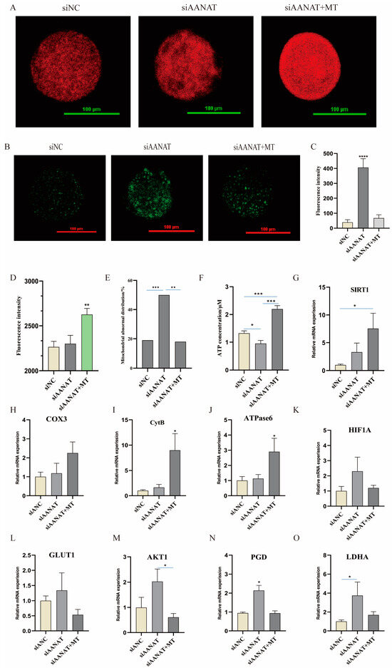 Effects of siAANAT on the metabolic patterns in porcine oocytes. (A) Fluorescence staining images of mitochondria in porcine oocytes. Scale: 100 μm. (B) ROS fluorescent staining in oocytes. (C) Statistic analysis of ROS fluorescence staining intensity in oocytes. SiNC (n = 6), siAANAT (n = 5), and siAANAT + MT (n = 8). (D) Fluorescence intensity of mitochondrial fluorescent staining. SiNC (n = 32), siAANAT (n = 17), and siAANAT + MT (n = 19). (E) Abnormal distribution ratio of mitochondria. siNC (n = 71), siAANAT (n = 34), and siAANAT + MT (n = 22) group. (F) ATP content. siNC (n = 48), siAANAT (n = 48), and siAANAT + MT (n = 48) group. (G) Relative SIRT1 mRNA expression level; n = 3. (H) Relative COX3 mRNA expression level; n = 3. (I) Relative CytB mRNA expression level; n = 3. (J) Relative ATPase6 mRNA expression level; n = 3. (K) Relative HIF1A mRNA expression level; n = 3. (L) Relative GLUT1 mRNA expression level; n = 3. (M) Relative AKT1 mRNA expression level; n = 3. (N) Relative PGD mRNA expression level; n = 3. (O) Relative LDHA mRNA expression level; n = 3. * p < 0.05, ** p < 0.01, *** p < 0.001 and **** p < 0.0001.