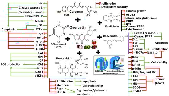 | Quercetin | FOLFOX + Trans-pterostilbene + radiotherapy | HT-29 xenograft in nu/nu nude mice | ↓ Tumor volume ↑ Bak, Bax, Bad, Bid, CAT, GPx, GR, SOD2, TrxR-1 ↓ Bcl-2 | [259] |