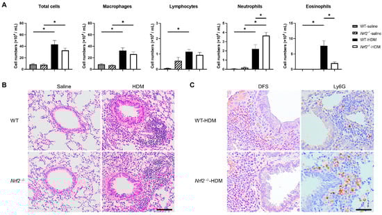 Deletion of nuclear factor erythroid-2-related factor 2 (Nrf2) exacerbated house dust mite (HDM)-induced neutrophilic airway inflammation. (A) Numbers of total cells, macrophages, lymphocytes, neutrophils, and eosinophils in the bronchoalveolar lavage fluid (BALF) of wild-type and Nrf2-deficient (Nrf2−/−) mice exposed to saline or HDM. The data shown are the mean ± SEM (n = 6–8) and are representative of three independent experiments. * p < 0.05, determined through one-way ANOVA, followed by the Tukey–Kramer test. (B) Representative images of hematoxylin and eosin (H&E) staining of lungs from wild-type and Nrf2−/− mice exposed to saline or HDM (scale bar: 100 µm). (C) Representative images of staining with direct fast scarlet (DFS) and anti-lymphocyte antigen 6 family member G (Ly6G) antibody to show eosinophil and neutrophil infiltration, respectively, in the lung tissue from wild-type and Nrf2−/− mice exposed to saline or HDM (scale bar: 50 µm). WT denotes wild-type.