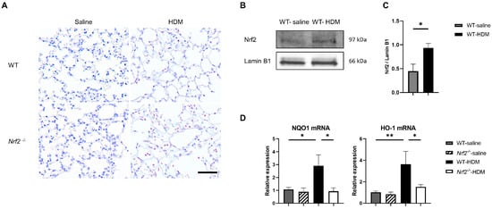 The absence of antioxidant stress response induction in Nrf2−/− mice upon exposure to HDM resulted in increased oxidative stress in the lung tissue. (A) Representative immunostaining of 8-hydroxy-deoxyguanosine (8-OHdG) in lung tissue from wild-type and Nrf2−/− mice exposed to saline or HDM (scale bar: 50 µm). (B) Representative Western blot of Nrf2 expression in lung nuclear extracts from wild-type mice exposed to saline or HDM. (C) Semi-quantitative analysis of Western blots. Values were normalized to lamin B1 and are presented as the mean ± SEM (n = 4). The data are representative of two independent experiments. * p < 0.05, determined through Student’s t-test. (D) Levels of mRNA transcripts encoding NAD(P)H:quinone-oxidoreductase-1 (NQO1) and heme oxygenase-1 (HO-1) in the lungs of each group of mice. The relative levels of gene expression were determined using the ΔΔCt method with the glyceraldehyde 3-phosphate dehydrogenase (GAPDH) gene as a reference. The data are presented as the mean ± SEM (n = 6–8) and are representative of two independent experiments. * p < 0.05 and ** p < 0.01, determined through one-way ANOVA, followed by the Tukey–Kramer test.