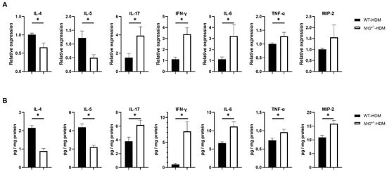 To understand how Nrf2 deficiency affects the profile of cytokines and chemokines in allergic airway inflammation, we examined the mRNA and protein expression levels of IL-4 and IL-5 (key mediators in type 2 inflammation), as well as IL-17, IFN-γ, IL-6, TNF-α, and MIP-2 (non-type 2 inflammation), in the lungs of wild-type and Nrf2−/− mice following HDM sensitization and challenge. Compared with the wild-type mice, the levels of the Th2 cytokines IL-4 and IL-5 were significantly decreased in the Nrf2−/− mice, while those of IL-17, IFN-γ, IL-6, and TNF-α were significantly increased (Figure 4A,B). For MIP-2, although its mRNA expression was slightly (but not significantly) increased, its protein level was significantly increased in the Nrf2−/− mice compared with the wild-type mice (Figure 4A,B). These results suggest that Th1, Th17, and proinflammatory cytokines that induce non-type 2 inflammation tend to predominate in asthma with a reduced antioxidant stress response, while Th2 cytokines that induce type 2 inflammation are suppressed.