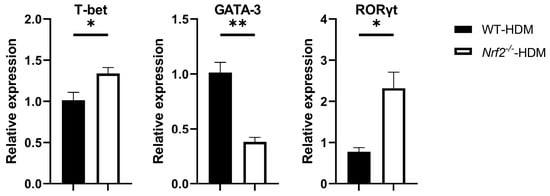 Based on the above changes in the cytokine milieu caused by Nrf2 deficiency, we next evaluated the gene expression levels of T-bet, GATA-3, and RORγt, which are master transcription factors for the differentiation of Th1, Th2, and Th17 cells, respectively, within the lung Th cells of each group of HDM-stimulated mice. The mRNA expression of GATA-3 decreased in the Nrf2−/− mice compared with the wild-type mice, while that of T-bet and RORγt increased, which is consistent with the changes in cytokine levels (Figure 5).