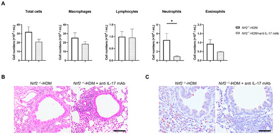 Neutralization of IL-17 reduced HDM-induced neutrophilic inflammation in the airways of Nrf2−/− mice. (A) Numbers of total cells, macrophages, lymphocytes, neutrophils, and eosinophils in the BALF of HDM-exposed Nrf2−/− mice treated with or without anti-IL-17 antibody. The data shown are the mean ± SEM (n = 4) and are representative of three independent experiments. * p < 0.05, determined through one-way ANOVA, followed by the Tukey–Kramer test. Representative images of staining with H&E (B) and anti-Ly6G antibody (C) to show neutrophil infiltration in the lung tissue from each group of mice (scale bar: 50 µm).