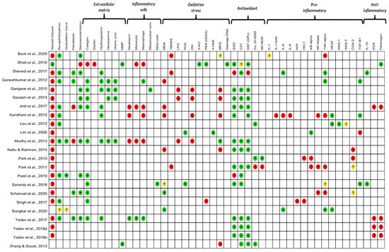 Results of the primary and secondary outcomes of the individual studies analyzed. The colour green: increased; red: decreased; yellow: undetermined and white: not analysed, indicate the results measured between the studies. MMP: matrix metalloproteinase; MDA: malondialdehyde; TBARS: Thiobarbituric acid reactive substances; LPO: lipid peroxidation; PCN: carbonylated protein; ON: nitric oxide; 3-NT: 3-nitrotyrosine; H2O2: hydrogen peroxide; 4HNE: 4-hydroxynonenal; MPO: metalloproteinase; SOD: superoxide dismutase; CAT: catalase; GST: glutathione transferase; CuZnSOD: copper–zinc superoxide dismutase; MnSOD: manganese superoxide dismutase; IL-1: interleukin-1; IL-1β: interleukin-1-beta; IL-6: interleukin-6; IL-8: interleukin-8; NRF2: nuclear factor erythroid factor 2; HO-1: the inducible isoform of HO; IKβ: Ikappaβ kinase; NF-kβ: nuclear factor kappa β; TNF-α: Tumor Necrosis Factor receptor alpha; VEGF: vascular endothelial growth factor; ANG1 and 2: angiotensin (1–2), COX-2: cyclooxygenase-2; TGF-β: transforming growth factor beta; IL-10: interleukin-10; CRP: C-reactive protein; FIB: fibrinogen. References of the articles in the figure: Back et al., 2020 [42]; Dhall et al., 2016 [43]; Dwivedi et al., 2017 [44]; Ganeshkumar et al., 2012 [45]; Gangwar et al., 2015 [46]; Gautam et al., 2014 [47]; Jridi et al., 2017 [48]; Kandhare et al., 2015 [49]; Leu et al., 2012 [50]; Lim et al., 2006 [51]; Murthy et al., 2013 [52]; Nafiu &Rahman, 2014 [53]; Park et al., 2010 [54]; Park et al., 2011 [55]; Patel et al., 2019 [56]; Sarandy et al., 2018 [57]; Schanuel et al., 2020 [58]; Singh et al., 2017 [59]; Sungkar et al., 2020 [60]; Yadav et al., 2017 [61]; Yadav et al., 2018a [62]; Yadav et al., 2018b [63]; Zhang & Gould, 2013 [64].