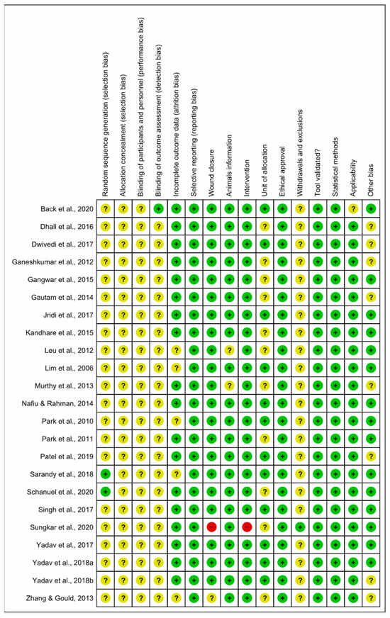 Systematic reviews are considered to be high-level studies, depending on the quality of the studies, and allow individual studies to be assessed in a blinded manner (without the influence of researchers), helping with decision-making, identifying gaps in knowledge, and allowing individual studies that can then guide future studies. In this case, the methodological heterogeneity between the studies analyzed was identified mainly from the divergent characteristics of the animal models, such as age, weight, and total number of animals. When assessing the risk of bias and methodological quality, we found that most of the studies did not clearly indicate the main outcomes assessed, and although only two studies (each) omitted information on wound closure and the intervention used, these studies presented a high risk of methodological bias, which prevented the reproducibility of the studies. Using the SYRCLE tool, we identified specific limitations in the research reports, mainly related to the omission of important information, such as the experimental randomization procedures, the procedures for assigning the animals to the experimental groups, the way the animals were housed, the data collection methods and the blinding of the researchers in relation to the experimental groups.