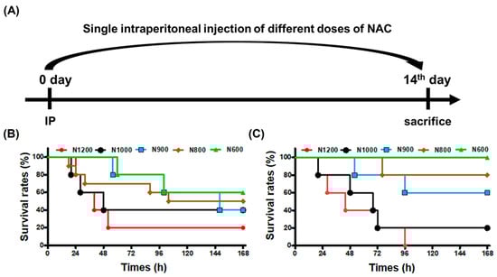 The flowchart (A) and the curves of the survival rates of mice (B,C) were shown for the acute toxicity assay after a single IP of different doses of NAC. The curves of the survival rates of male (B) and female (C) mice for an IP of indicated doses of NAC were shown in different colors.