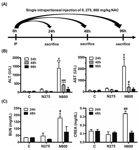The flowchart (A) and serum liver and kidney biochemical indices in normal male mice (B) after an IP of different doses of NAC. Serum ALT and AST activities (B), and serum BUN and CREA levels (C) of mice in the indicated groups were sacrificed at the indicated time points. * (p < 0.05), ** (p < 0.01), and *** (p < 0.001) denote significant differences compared with the C group; # (p < 0.05), ## (p < 0.01), and ### (p < 0.001) denote significant differences compared with the N275 group.