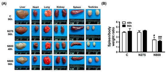 To elucidate the potential toxic mechanism(s) in normal male mice, we examined the major organs at 48 h and 96 h after an IP of N800. We found no significant changes in organ weights, except for the spleen, liver, and testes (Figure 4A). In the N800 group, white liver lobes and shrunken spleen were noted when compared with C or N275 groups. Furthermore, both N800 and N275 group mice had smaller testes than C group mice. The ratios of spleen weight to body weight in N800 group were much lower than in the other groups (Figure 4B, all p < 0.05).