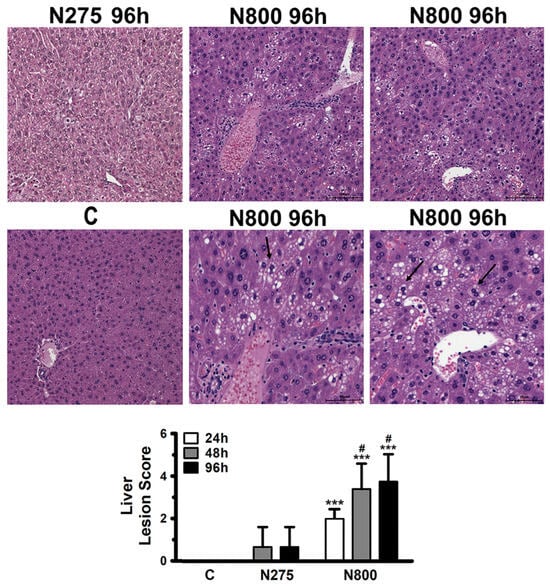 Histopathological findings of liver sections and liver lesion scores in normal male mice after an IP of indicated doses of NAC. Normal hepatocytes were found in the C group (middle-left panel). Multifocal slight fatty changes (arrows) in the portal area were noted in the N800 group at 96 h (middle-center and -right panels). Liver lesion scores were calculated for the indicated groups at the indicated time points (lower panel). *** (p < 0.001) denotes significant difference compared with the C group; # (p < 0.05) denotes significant difference compared with the N275 group. Scale bar: 100 μm (upper panels and the C group) and 50 μm (middle panels).