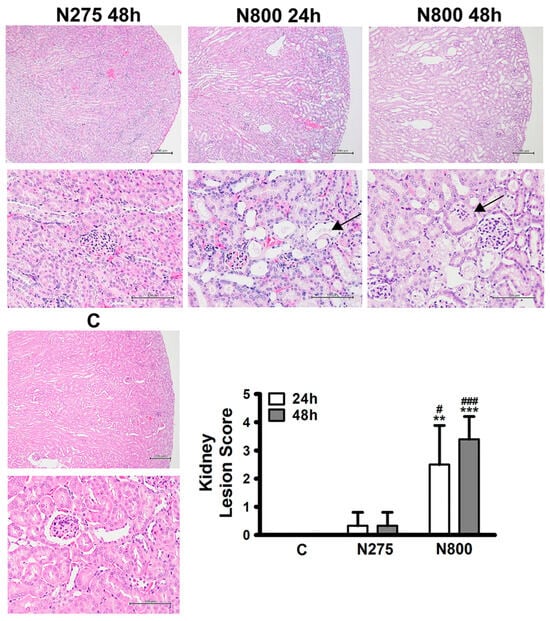 Since the kidney biochemical indices, BUN and CREA, in the N800 group had declined to levels similar to the C or the N275 group at 48 h (Figure 3C), histopathological analyses of kidney sections and kidney lesion scores were performed at 24 h and 48 h. The H&E staining of kidney sections showed tubular degeneration, necrosis, and dilation in the renal cortex of the N800 group at 24 h and 48 h (Figure 6, upper-center and -right and middle-center and -right panels). The kidney injury scores of each group of mice were statistically analyzed. The N800 group mice had significantly higher kidney injury scores than the C and N275 group mice at 24 h and 48 h (all p < 0.05). Since the serum BUN/CREA levels of the N800 group were significantly higher than those of the C and N275 groups at 24 h and 48 h (Figure 3C), the results of kidney histopathology also demonstrated that an IP of N800 induced acute kidney injury.