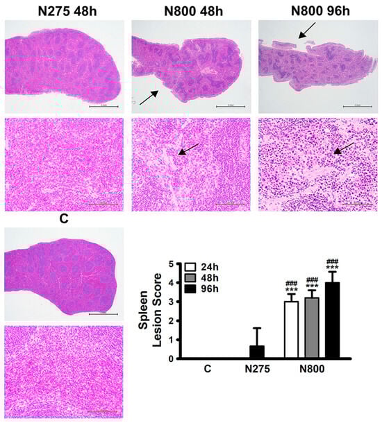 Since shrunken spleen and low spleen weight to body weight ratios were obtained in the N800 group (Figure 4), histopathological analyses of spleen sections and spleen lesion scores were performed. The H&E staining of spleen sections revealed diffuse and moderate to severe red pulp depletion in the N800 group at 48 h and 96 h post-NAC exposure, along with trabecular and capsular shrinkage due to red pulp atrophy (Figure 7, middle-center and -right panels). The N800 group mice had significantly higher spleen injury scores than the C and N275 group mice at 24 h, 48 h and 96 h (Figure 7, lower-right panel, all p < 0.001).