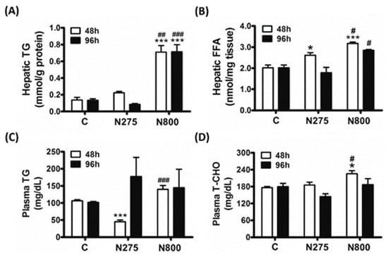 We also measured the plasma TG and T-CHO levels (Figure 8C,D). N275 showed lower TG levels at 48 h (p < 0.001) compared with the C group, but with increased TG levels at 96 h (Figure 8C). However, N275 did not significantly affect plasma T-CHO levels (Figure 8D). N800 significantly elevated TG levels compared with the C group (p < 0.001) and T-CHO levels compared with the C and N275 groups (both p < 0.05) at 48 h. At 96 h, N800 maintained high TG levels, but T-CHO levels were similar to the C group. Both plasma TG and T-CHO levels in N800 were higher than those in N275 at 48 h (TG: p < 0.001; T-CHO: p < 0.05) but similar at 96 h.