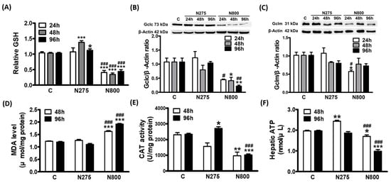 We investigated the effects of different doses of NAC, a GSH precursor, on hepatic GSH levels and synthetic enzyme levels at the indicated time points. The N275 group had significantly higher GSH levels than the C group at 48 h and 96 h (48 h: p < 0.001; 96 h: p < 0.05) (Figure 9A). However, the N800 group had significantly lower GSH levels at all these time points than the C and N275 groups (all p < 0.001). GSH synthesis depends on glutamate cysteine ligase (Gcl), which is composed of catalytic (Gclc) and modifier (Gclm) subunits. The expression levels of Gclc and Gclm were measured by Western blotting (Figure 9B,C). There were no significant differences in Gclc expressions between the N275 and C groups, with slightly lower Gclm expressions in N275 at 48 h and 96 h. The N800 group showed significantly lower Gclc expressions than the C group at 48 h (p < 0.05) and 96 h (p < 0.01) and the N275 group at 24 h (p < 0.05) and 96 h (p < 0.01). In addition, Gclm expressions were also lower in the N800 group than in the C and N275 groups, but these differences were only significant at 24 h (both p < 0.05). The results in Figure 9A–C indicate that an IP of N800 reduced GSH synthesis by downregulating Gclc and Gclm, resulting in intensely decreased hepatic GSH levels.
