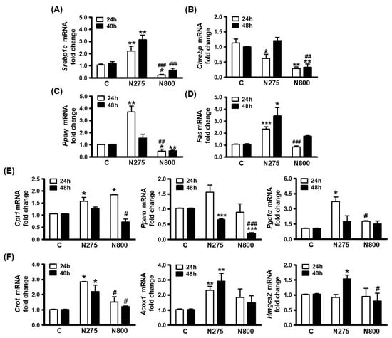 Moreover, we evaluated the gene expressions involved in peroxisomal lipid β-oxidation (Figure 10F, left and middle panels). The N275 group showed significantly higher expressions of Crot (both p < 0.05) and Acox1 (both p < 0.01) than the C group at both time points. The N800 group exhibited similar Crot and Acox1 mRNA levels to the C group, but a significantly lower Crot level than the N275 group at both time points (both p < 0.05). We also assessed expressions of Hmgcs2, a key rate-limiting enzyme for ketone body synthesis (Figure 10F, right panel). The N275 group showed significantly higher Hmgcs2 level at 48 h than the C group (p < 0.05). The N800 group exhibited similar levels of Hmgcs2 expressions at both time points compared to the C group, but had a significantly lower Hmgcs2 level than the N275 group at 48 h (p < 0.05). In brief, these findings indicate that N275 treatment enhances peroxisomal lipid β-oxidation and ketone body synthesis by upregulating Crot, Acox1, and Hmgcs2. Compared with N275 treatment, N800 treatment reduces peroxisomal lipid β-oxidation and ketone body synthesis by downregulating Crot and Hmgcs2. Therefore, N275 treatment stimulates both the catabolic and anabolic pathways of hepatic lipids, resulting in a balance of lipid metabolism, N800 treatment interferes with mitochondrial lipid β-oxidation and reduces both peroxisomal lipid β-oxidation and ketone body synthesis, leading to hepatic MS.