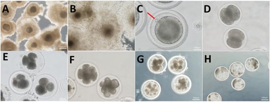 Mature morphology and parthenogenetically activated embryonic development of yak COCs. (A) Immature COCs. (B) Mature COCs. (C) Mature oocytes excrete the first polar body (red arrow). (D–H) Respectively represent the activation of yak parthenogenetic embryos in the development of 2-cell, 4-cell, 8-cell, morula, and blastocyst stages; bar = 100 μm.