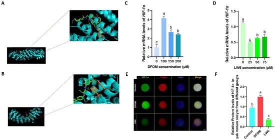 DFOM and LW6 regulate the expression of HIF-1α. (A) Molecular docking model of DFOM and HIF-1α. (B) Molecular docking model of LW6 and HIF-1α. (C) Relative expression level of HIF-1α mRNA after treatment with different concentrations of DFOM. (D) Relative expression level of HIF-1α mRNA after treatment with different concentrations of LW6. (E) HIF-1α protein in mature oocytes of yak in different treatment groups Immunofluorescence labeling. (F) Relative expression levels of HIF-1α protein in mature oocytes of yak in different treatment groups. Bar = 50 μm. Different letters in the histogram indicate statistically significant differences, p < 0.05.
