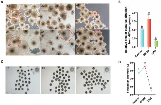 To determine the cumulus expansion area of yak mature oocytes in different treatment groups, the immature COCs in each group were compared with the mature COCs (Figure 3A). Results indicated a significantly higher cumulus expansion area in the DFOM group compared to the control group (p < 0.05), while the LW6 group showed a significant decrease (p < 0.05) (Figure 3B). Furthermore, the first polar body excretion rate of each treatment group was assessed. After maturation, cumulus cells were removed with hyaluronic acid to obtain naked eggs, and the first polar body was observed by gently blowing the rotating oocytes with a suction needle under a stereomicroscope (Figure 3C). The results revealed a significantly higher first polar body rate in oocytes from the DFOM group compared to the control group (p < 0.05) and a significantly lower rate in the LW6 group compared to the control group (p < 0.05) (Figure 3D).