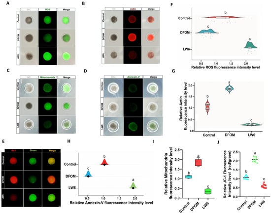 The effect of HIF-1α on the developmental potential of yak oocytes. (A) Effects of different treatment groups on ROS in oocytes. (B) The effect of different treatment groups on oocyte actin. (C) Effects of different treatment groups on the distribution of oocyte mitochondria. (D) Effects of different treatment groups on early apoptosis of oocytes. (E) The effect of different treatment groups on the distribution of oocyte mitochondria. (F) Relative fluorescence intensity of ROS in oocytes of different treatment groups. (G) Relative fluorescence intensity of actin in oocytes of different treatment groups. (H) Relative fluorescence intensity of oocyte apoptosis in different treatment groups. (I) Relative fluorescence intensity of oocyte mitochondria in different treatment groups. (J) Effects of different treatment groups on mitochondrial membrane potential of oocytes. Bar = 50 μm. Different letters in the histogram indicate statistically significant differences (p < 0.05).