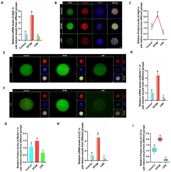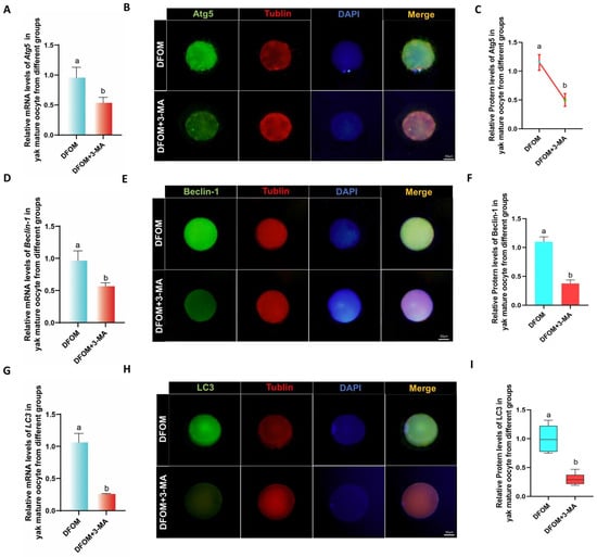 3-MA regulated the level of autophagy-related factors in yak oocytes. (A,D,G) The relative expression levels of Atg5, Beclin-1, and LC3 mRNA in oocytes of different treatment groups. (B,E,H) Immunofluorescence labeling of Atg5, Beclin-1, and LC3 proteins in oocytes of different treatment groups. (C,F,I) The relative expression levels of Atg5, Beclin-1, and LC3 proteins in yak mature oocytes of different treatment groups. Bar = 50 μm. The difference of different letters in the histogram was statistically significant (p < 0.05).