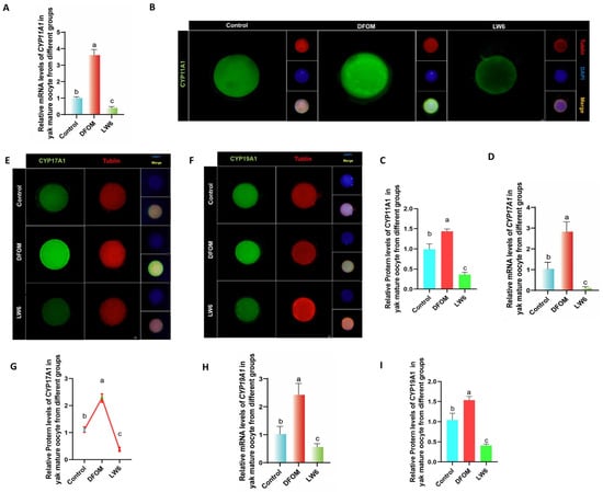 CYP450s were analyzed using RT-qPCR to assess the mRNA levels of CYP11A1, CYP17A1, and CYP19A1 in oocytes from various treatment groups. Results indicated significantly higher mRNA levels of CYP11A1, CYP17A1, and CYP19A1 in oocytes from the DFOM group compared to the control group (p < 0.05), whereas the LW6 group exhibited the opposite trend (Figure 6A,D,G). Additionally, immunofluorescence labeling was used to detect CYP11A1, CYP17A1, and CYP19A1 proteins (Figure 6B,E,F). The protein levels of CYP11A1, CYP17A1, and CYP19A1 in oocytes from the DFOM group were significantly higher than those in the control group (p < 0.05), while the LW6 group showed significantly lower protein levels (p < 0.05) (Figure 6C,G,I).