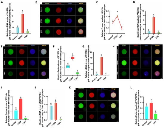 Changes in cumulus diffusion-related factors in yak oocytes were examined by introducing different treatments to an in vitro culture model. After 24 h, oocytes were retrieved to assess the expression of cumulus diffusion marker genes during in vitro maturation. RT-qPCR analysis revealed that in comparison to the control group, the mRNA levels of HAS2, PTGS2, PTX3, and TNFAIP6 were significantly elevated in the DFOM group (p < 0.05), while the LW6 group exhibited the opposite trend (Figure 7A,D,G,J). In order to further verify these results, immunofluorescence labeling was conducted to analyze the expression of HAS2, PTGS2, PTX3, and TNFAIP6 proteins (Figure 7B,E,H,K). The results indicated that the changes in cumulus diffusion-related factors were consistent with mRNA expression trends. Specifically, the protein levels of HAS2, PTGS2, PTX3, and TNFAIP6 were significantly higher in the DFOM group compared to the control group (p < 0.05). Conversely, the protein levels of these proteins in the LW6 group were significantly lower than those in the control group (p < 0.05) (Figure 7C,F,I,L).