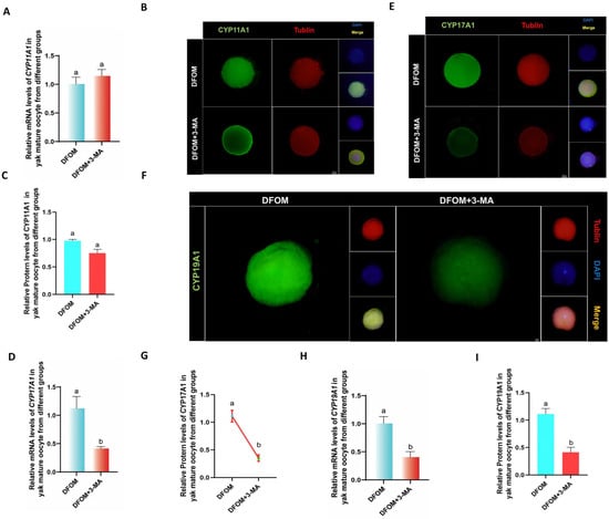 RT-qPCR was utilized to assess the levels of CYP450s-related factors CYP11A1, CYP17A1, and CYP19A1 in oocytes following a reduction in autophagy levels. The combined treatment of DFOM and 3-MA resulted in significantly lower levels of CYP17A1 and CYP19A1 mRNA compared to the DFOM group (p < 0.05). There was no significant difference in CYP11A1 (p > 0.05). (Figure 8A,D,G). The immunofluorescence labeling of CYP11A1, CYP17A1, and CYP19A1 proteins showed a significant decrease in CYP17A1 and CYP19A1 levels in oocytes from the combined treatment group compared to the DFOM group (p < 0.05). There was no significant difference in CYP11A1 (p > 0.05) (Figure 9B,C,E–G,I). These findings support the role of HIF-1α in regulating CYP450s-related factors in yak oocytes through autophagy.