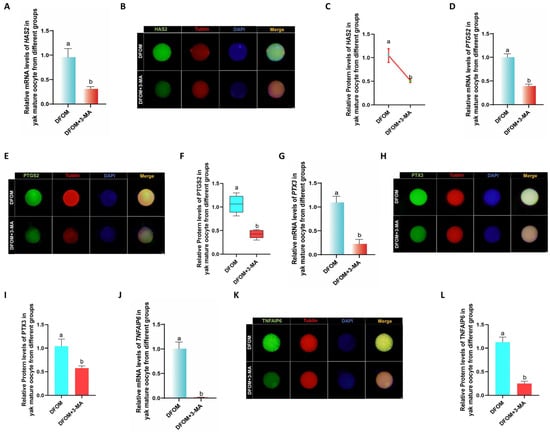 To investigate changes in cumulus diffusion-related factors in oocytes following a reduction in autophagy levels, RT-qPCR was utilized to measure the mRNA levels of HAS2, PTGS2, PTX3, and TNFAIP6 in oocytes from various treatment groups. The mRNA levels of these factors in oocytes treated with DFOM combined with 3-MA were significantly lower than those in the DFOM group (p < 0.05) (Figure 10A,D,G,J). Subsequently, immunofluorescence labeling of HAS2, PTGS2, PTX3, and TNFAIP6 proteins (Figure 10B,E,H,K) further supported these findings, showing a consistent trend with mRNA expression. Protein levels of these factors in oocytes treated with DFOM combined with 3-MA were also significantly reduced compared to the DFOM group (p < 0.05) (Figure 10C,F,I,L). These results confirm that HIF-1α can modulate cumulus diffusion-related factors in yak oocytes through autophagy.