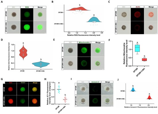 To investigate the impact of reduced autophagy on the developmental potential of oocytes, DCFH staining was utilized to compare ROS levels in different treatment groups (Figure 11A). Results indicated a significant increase in ROS production in oocytes treated with DFOM and 3-MA combined, compared to those treated with DFOM alone (p < 0.05) (Figure 11B). Actin levels in oocytes were assessed using Phalloidin-iFluor TM 488 Conjugate staining (Figure 11C), revealing a significant reduction in actin levels with the addition of 3-MA in the oocyte maturation system, as opposed to the DFOM group (p < 0.05) (Figure 11D). The mitochondrial distribution was examined using MitoTracker® Mitochondrion-Selective Probes (Figure 11E), showing a lower mitochondrial level in oocytes from the DFOM + 3-MA group compared to the DFOM group (p < 0.05) (Figure 11F). The evaluation of mitochondrial membrane potential (ΔΨm) through JC-1 staining (Figure 11G) demonstrated a significant reduction in the DFOM and 3-MA combined treatment group as opposed to the DFOM group (p < 0.05) (Figure 11H). Early apoptosis in oocytes was assessed using the Annexin V-FITC apoptosis detection kit (Figure 11I), with results showing a higher level of early apoptosis in oocytes from the DFOM combined with the 3-MA treatment group, compared to the DFOM group (p < 0.05) (Figure 11J).
