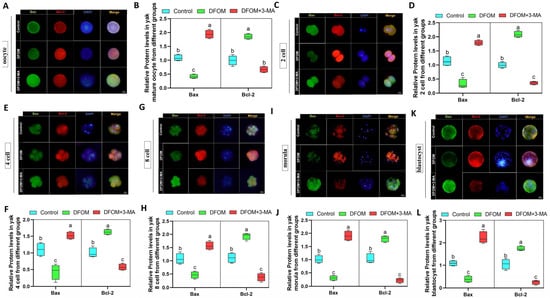 This study investigated the role of HIF-1α in regulating the expression of Bax/Bcl-2 in yak oocytes and preimplantation parthenogenetically activated embryos through autophagy. DFOM was used to modulate HIF-1α levels, while 3-MA was added to decrease autophagy. Immunofluorescence labeling of Bax and Bcl-2 proteins was conducted at different developmental stages of oocytes and embryos (Figure 12A,C,E,G,I,K). The results revealed that the DFOM group exhibited a significant decrease in Bax protein levels and an increase in Bcl-2 protein levels compared to the control group (p < 0.05). Conversely, the combination of DFOM and 3-MA treatment resulted in the opposite effect (Figure 12B,D,F,H,J,L).