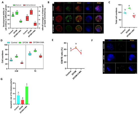 To investigate the potential role of HIF-1α in regulating blastocyst development following parthenogenetic activation of yak oocytes through autophagy, the blastocyst rate and hatching blastocyst rate of various treatment groups were analyzed. Results indicated that the blastocyst rate and hatching blastocyst rate of parthenogenetic embryos in the DFOM group were significantly higher compared to the control group (p < 0.05), while the DFOM and 3-MA combined treatment group showed the opposite trend (Figure 13A). Subsequent immunofluorescence labeling of ICM and TE of blastocysts using CDX2 and SOX2 proteins revealed an increased total number of blastocysts in the DFOM group, with higher ICM and TE counts. Notably, the ICM/TE ratio was significantly elevated in the DFOM group (p < 0.05), suggesting that the upregulation of HIF-1α could enhance blastocyst quality and promote ICM fate, leading to a higher number of ICM cells. The inhibition of autophagy hindered these effects (Figure 13B–E). Furthermore, TUNEL analysis demonstrated that the apoptosis rate of blastocysts in the DFOM group was significantly lower than in the control group (p < 0.05), while the DFOM combined with the 3-MA group exhibited a higher apoptosis rate than the control group (p < 0.05) (Figure 13F,G).
