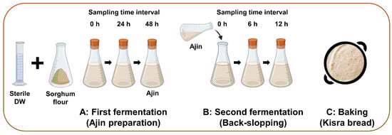 Briefly, under sterile conditions, starter sourdough “ajin” was prepared traditionally by mixing 100 g of sorghum flour (Bob’s Red Mill, Milwaukee, OR, USA) with 200 mL of sterile distilled water (ratio of 1:2 (w/v)) in a covered conical flask and fermented at 37 °C for 48 h. The samples were taken aseptically at 0, 24, and 48 h.