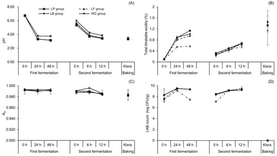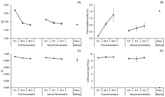 Changes in physicochemical and microbiological properties of kisra bread during natural fermentation. (A) pH, (B) total titratable acidity, (C) water activity, (D) LAB count. Error bars indicate standard deviations calculated from three trials.