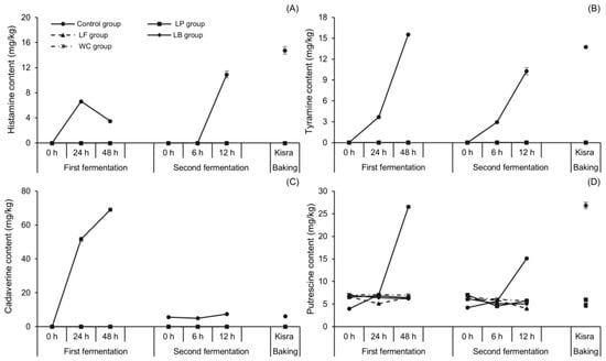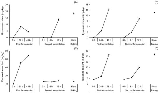Changes in BA concentrations of kisra bread during natural fermentation. (A) histamine, (B) tyramine, (C) cadaverine, (D) putrescine. The natural fermentation group shown in this figure also served as the control group in Figure 5. Error bars indicate standard deviations calculated from three trials.