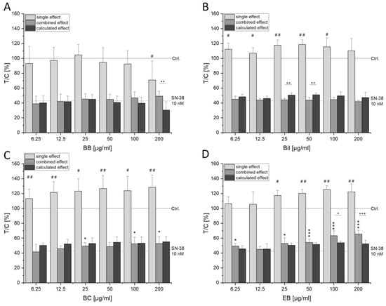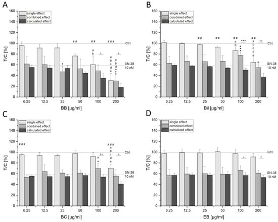Cytotoxic properties of anthocyanin-rich extracts BB (A), Bil (B), BC (C) and EB (D) in HCEC-1CT cells measured with WST-1 assay. Cells were incubated for 72 h with increasing concentrations of extracts alone (light gray bars) or together with 10 nM SN-38 (middle gray bars). The dashed line indicates the mean value received after 72 h incubation with 10 nM SN-38 (58.3 ± 12.3%). Graphs show the mean + SD of 3–5 independent biological replicates measured in technical triplicates relative to the solvent control (y = 100%, Ctrl., 0.6% DMSO). Dark gray bars depict the EV calculated with IJA, and significant differences to the measured combined effects were calculated with two-sample Student’s t-test (+ p < 0.05, ++ p < 0.01, +++ p < 0.001). Statistical differences to the respective control were calculated with one-sample (## p < 0.01, ### p < 0.001) or two-sample (* p < 0.05, *** p < 0.001) Student’s t-tests. Differences among the concentrations were determined with one-way ANOVA via post hoc Bonferroni test (p < 0.05, a–e; e.g., the letter a represents significant difference to the lowest tested concentration of 6.25 µg/mL).
