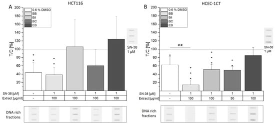 ICE assay detection of covalently bound DNA/topo I intermediates in HCT116 (A) and HCEC-1CT (B) cells. Cells were pre-incubated with extracts for 30 min, followed by co-incubation with 1 µM SN-38 for 1 h. A representative immunoblot from 3-5 biological replicates depicting the DNA-rich fractions used for evaluation is shown with equally modified contrast to improve visualization. Data shown are the means + SD evaluated as T/C of the SN-38 control in %. Significances compared to the SN-38 control were calculated with one-sample Student’s t-tests (* p < 0.05, ** p < 0.01, *** p < 0.001), and significant differences to the solvent control were evaluated with two-sample Student’s t-tests (## p < 0.01).