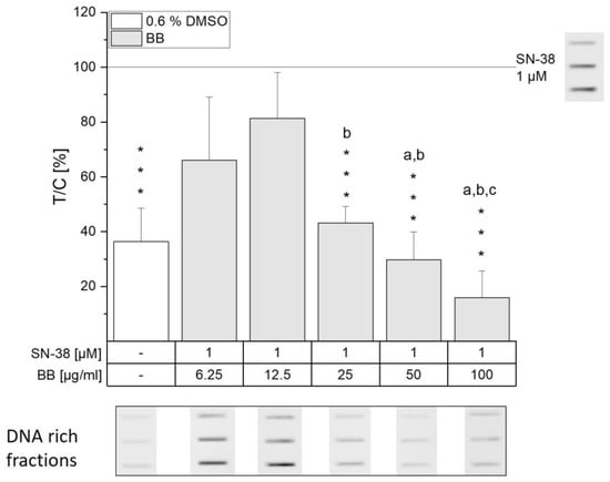 Covalently bound DNA/topo I intermediates after pre-incubation with increasing concentrations of BB extract and subsequent co-incubation with 1 µM SN-38 in HCEC-1CT cells according to the ICE assay. A representative immunoblot from 3-7 biological replicates showing the DNA-rich fractions with equally modified contrast for optimized visualization is shown. Data depicted are the means + SD evaluated as T/C of the SN-38 control in %. Significances compared to the SN-38 control were calculated with one-sample Student’s t-tests (*** p < 0.001). One-way ANOVA with post hoc Bonferroni test was used to determine statistically significant differences among the tested BB concentrations (p < 0.05, a–c; e.g., the letter a represents significance to the lowest concentration of 6.25 µg/mL).