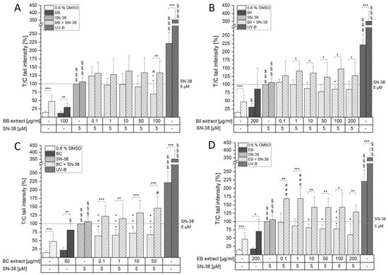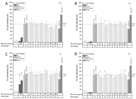 DNA-damaging effects of BB (A), Bil (B), BC (C) and EB (D) extracts alone and in combination with SN-38 on HCT116 cells. Cells were exposed to extracts for 30 min and then additionally challenged with 5 µM SN-38 for 1 h. UV-B irradiation for 1 min served as a positive control. Striped bars indicate additional exposure to FPG enzyme. Data shown are the means + SD of 3-4 biological replicates expressed as T/C relative to SN-38 in %. Significant differences to the respective solvent control were calculated with one- and two-sample Student’s t-tests and marked with $ (without FPG, $ p < 0.05, $$$ p < 0.001) and § (with FPG, § p < 0.05, §§§ p < 0.001). Statistical significances compared to SN-38 were tested with one-sample Student’s t-tests (without FPG; * p < 0.05, ** p < 0.001) or two-sample Student’s t-tests (with FPG). Differences between FPG-treatments were calculated with two-sample Student’s t-tests and marked with * p < 0.05, *** p < 0.001.