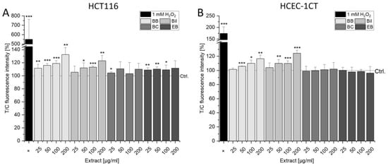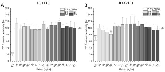 Effect of anthocyanin-rich extracts on H2O2-dependent ROS induction in HCT116 (A) and HCEC-1CT (B) cells after 30 min. Cells were pre-incubated for 24 h with extracts, stained with DCFH-DA solution for 15 min and subsequently challenged with 1 mM H2O2. Results presented are the means + SD of 4–6 biological replicates evaluated as T/C of the fluorescence intensity signal relative to the H2O2 control after 30 min. Cells treated only with 0.5% DMSO were used as control for proper signal induction by H2O2. Significant differences to the H2O2 control were calculated with one-sample Student’s t-tests (* p < 0.05, ** p < 0.01, *** p < 0.001).