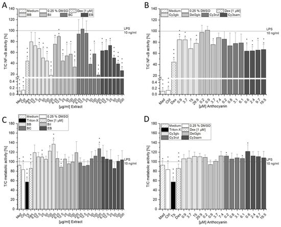 Immunomodulatory effects of anthocyanin-rich extracts (A) and single anthocyanins (B) and their corresponding cytotoxic properties (C,D) measured with the NF-κB and CTB assay, respectively. THP1-LuciaTM cells were pre-incubated with extracts or anthocyanins for 2 h and subsequently additionally challenged with 10 ng/mL LPS for 18 h. Pre-incubation with 1 µM Dex served as positive control for anti-inflammatory properties. Cell culture medium and 0.25% DMSO served as controls for proper activation of the NF-κB pathway. For the CTB cytotoxicity assay, 0.01% TX served as a positive control. Results show the mean + SD of 3-5 independent replicates measured in technical triplicates expressed as T/C in % relative to the LPS control. Statistically significant differences to the LPS control were calculated with one-sample Student’s t-tests (* p < 0.05, ** p < 0.01, *** p < 0.001).