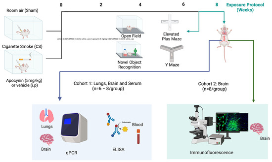 Timeline of the experimental design. Mice were either exposed to room air (sham) or cigarette smoke (CS; 9 cigarettes/day, 5 days/week) and administered either a vehicle (0.01% DMSO in sterile saline, i.p.) or apocynin (5 mg/kg, 0.01% DMSO in sterile saline, i.p.) for 8 weeks. A week before the protocol ended (week 7), neurocognitive assessments were conducted. Lungs were collected for qPCR, serum for ELISA, bronchoalveolar lavage fluid (BALF) for cytospins, and brains for qPCR, and immunohistochemistry.